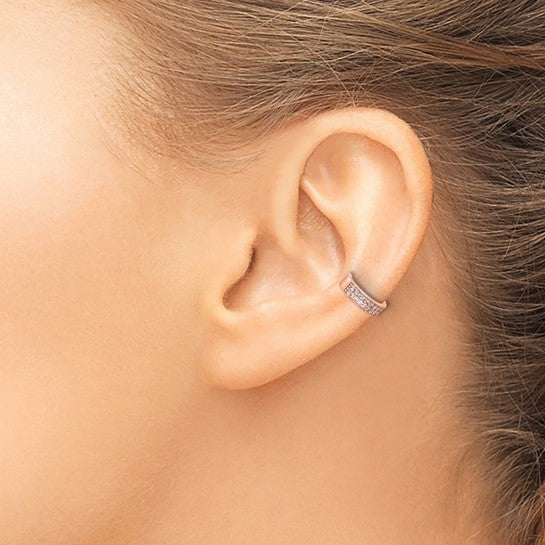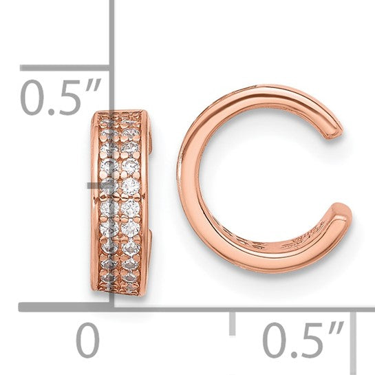 Experience timeless elegance with our Sterling Silver Rose-tone Polished Two Row CZ Pair of 2 Cuff Earrings. Crafted from high-quality sterling silver, these earrings showcase a stunning polished finish and four rows of sparkling cubic zirconia stones. Add a touch of sophistication to any outfit with this single cuff earring.