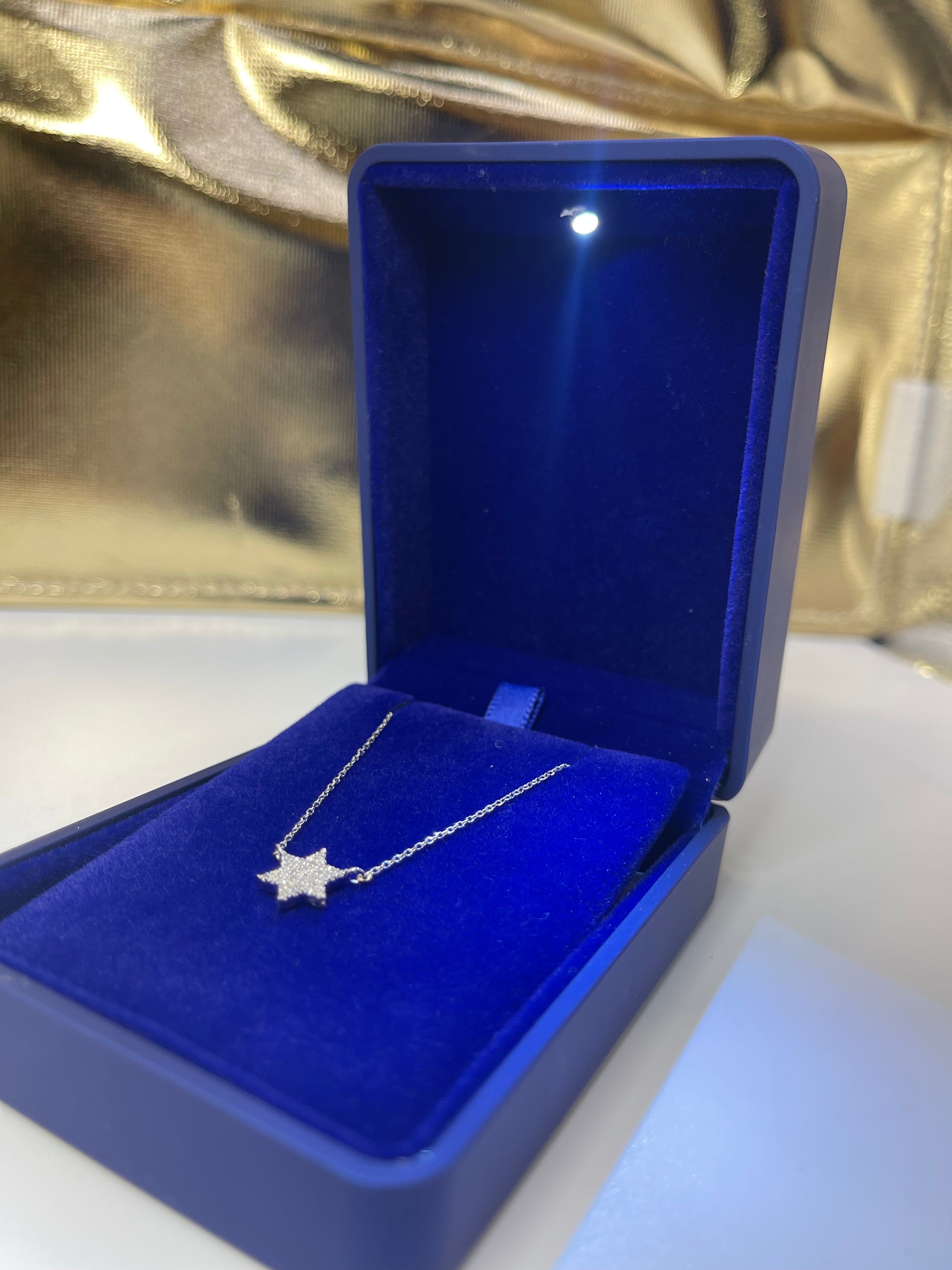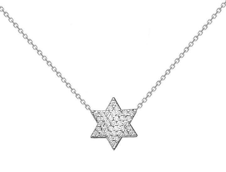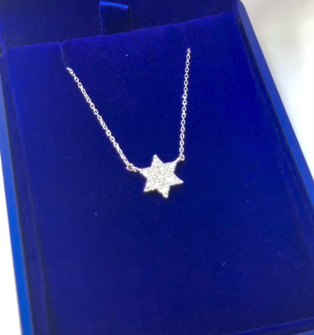Embrace the elegance of the MINI 8.5mm Diamond Star of David necklace. Crafted with 14k white gold and adorned with sparkling diamonds, this piece exudes sophistication and exclusivity. Total weight of gold - 1.8g, Total weight of Diamonds - 0.15TCW. Presented in a beautiful gift box with light, it's the perfect gift for yourself or a loved one. Elevate any outfit with this dazzling treasure.